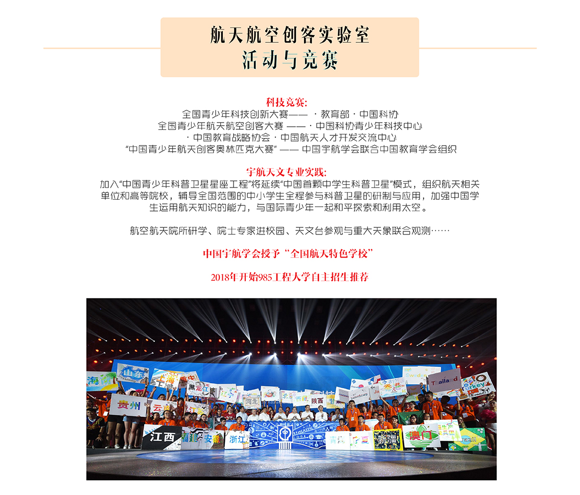 航天已成為高科技代名詞,創新是引領航天高科技發展的第一動力,融入航天科技與文化的創新教育更能激發學生的探索欲和成就感,把航天科學融入到中小學科學素質教育體系中,既是全面落實國民素質教育行動綱領、實現“大眾創業、萬眾創新”的需要。