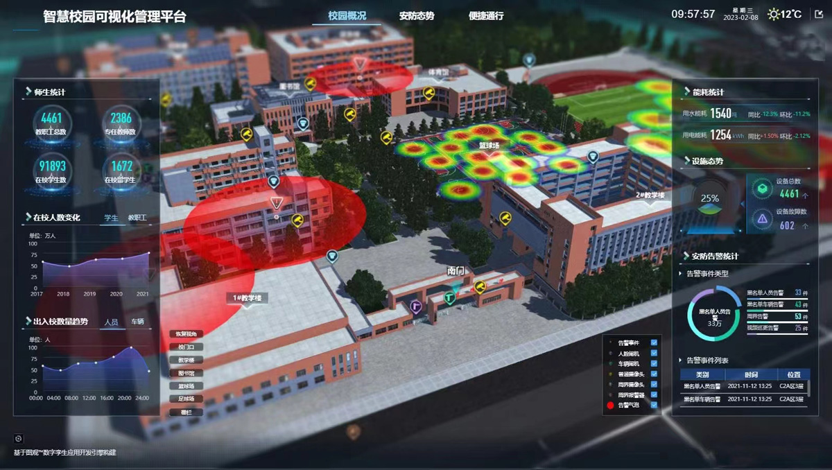 校園可視化管理平臺可直觀展示學校日常業務應用所產生的各類數據。學校可自定義所需展示的信息,例如教職工考勤、疾控安全、預警通知等,對校園進行全天候實時監測,方便學校管理者快速掌握校園整體情況。