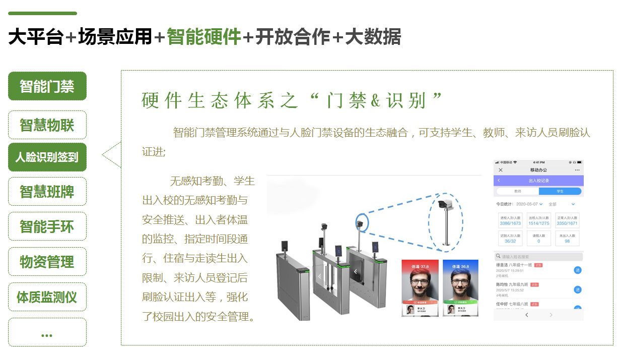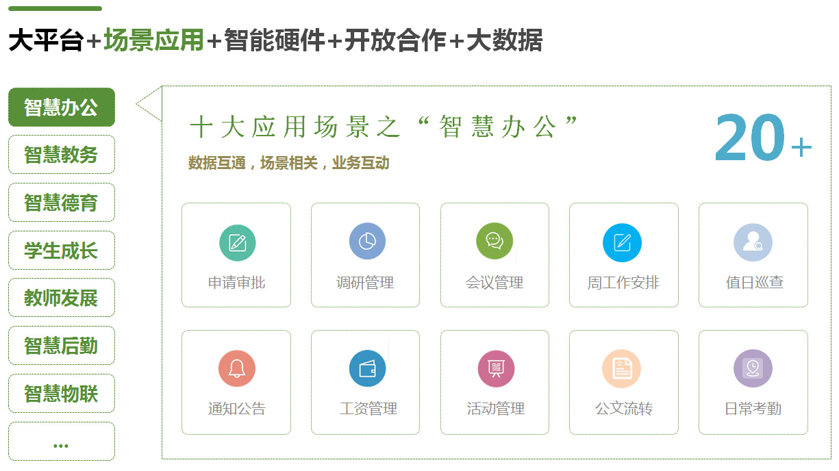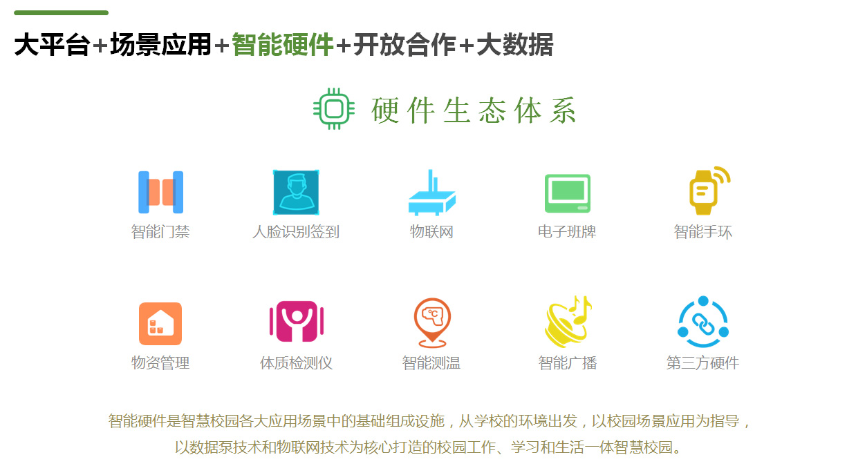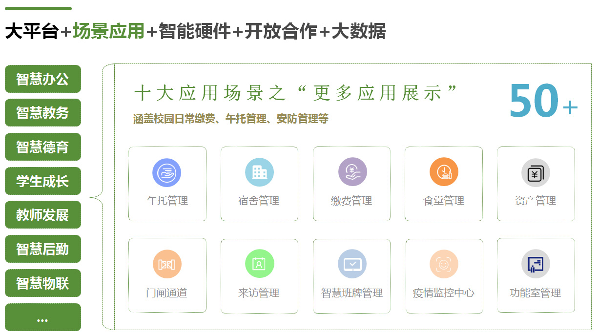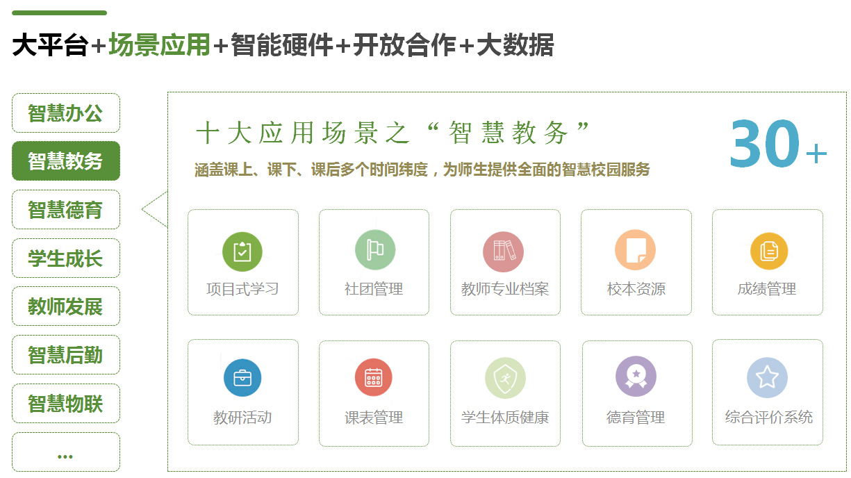 智慧校園平臺是以智慧管理、智慧教學、智慧環境、智慧安全四大體系為核心建設的統一信息化平臺,包含多項貼合校園實際需求的應用,將學校軟硬件系統全面打通,利用云計算和人工智能等技術進行針對性分析和個性化指導,提升教學、教研、管理水平。