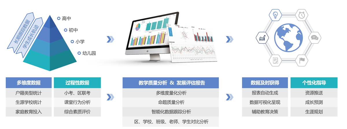 實現從組織聯考,到導入聯考成績,再到考試成績分析的一體化業務流程,最終可輸出80多項報表,為區級或校級發展評估和教學教研工作提供指導。