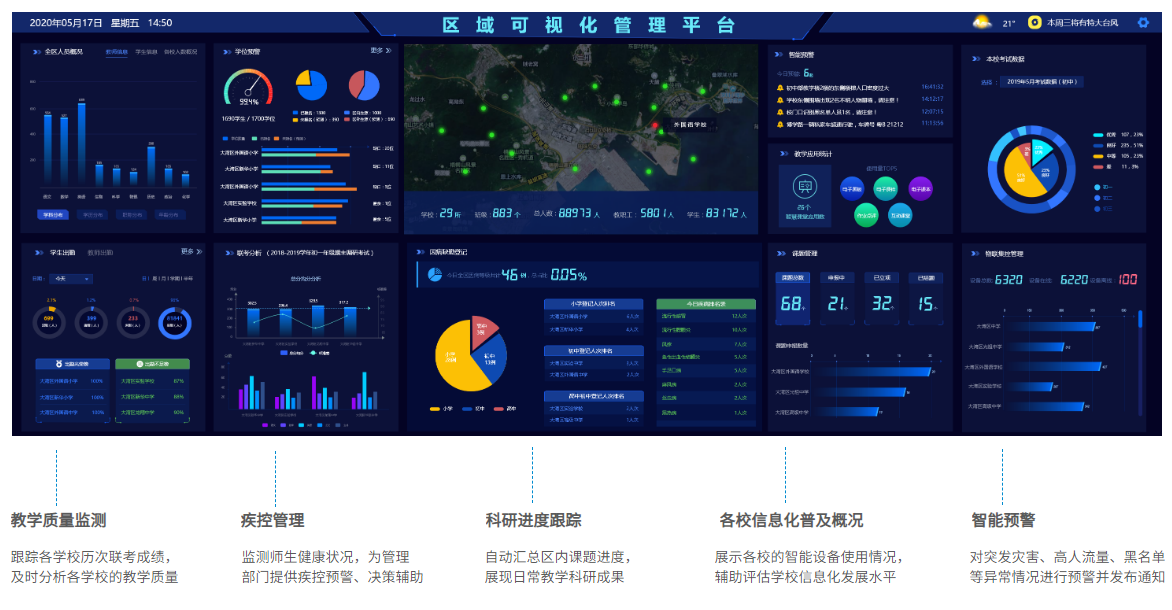 教育局大數據平臺不僅可統籌組織區校聯考、課題申報等區域性活動,還可匯總各校業務數據形成教學分析報告,并通過數據大屏實現可視化的融合處理,實時反映區域內的辦學情況。利用大數據分析,生成學生、教師、學校、區域各級畫像,輔助教育局精準診斷區域內的教育問題,做好教育導向和決策。